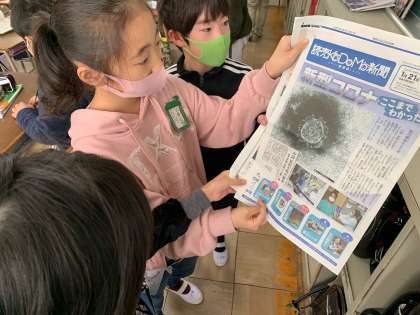 写真は、児童が少し前の新聞を読んでいる様子です。