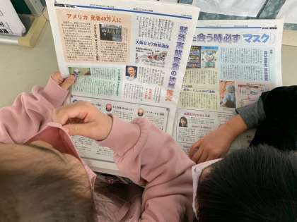 現在の他国の様子や、マスクの色に合わせた服のコーディネートなど、子ども達は興味を持って新聞を読んでいました。