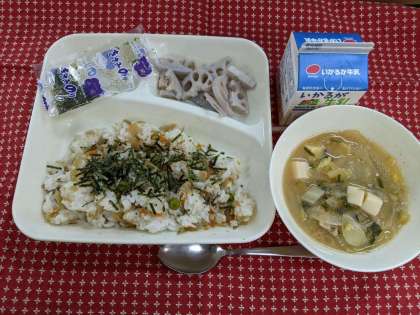 2月1日(月)のこんだては「鶏ごぼうご飯、みそ汁、焼きれんこん、牛乳」です。