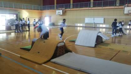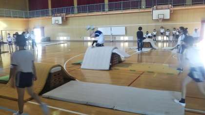 2月の体育科の学習では、講堂では器械運動に取り組んでいます。