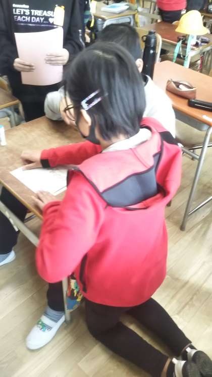 どの順番でワークシートを貼ろうかと困っていた友達のもとにかけ寄り、サポートしています。