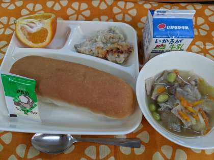 2月9日(火)のこんだては「押し麦のグラタン、スープ、いよかん、コッペパン、マーガリン、牛乳」です。