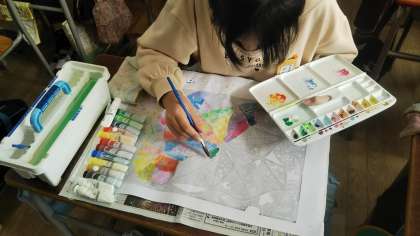 裏から、配色と水の量に気をつけて、グラデーションなどの工夫をする子供たち。