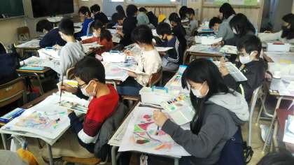 2月10日(水)、図画工作科「Wish!私だけの模様」の学習で、先週に刷った自分の作品に色をつけていきました。