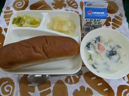 2月15日(月)のこんだては「ほうれん草のクリームシチュー、キャベツのサラダ、洋なし(缶)、黒糖パン、牛乳」です。