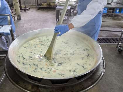 クリームシチューは、小麦粉を色づかないようにいためて、ホワイトルウを作ります。ルウを加えた後は、釜の底が焦げ付かないように絶えず混ぜながら煮込みます。