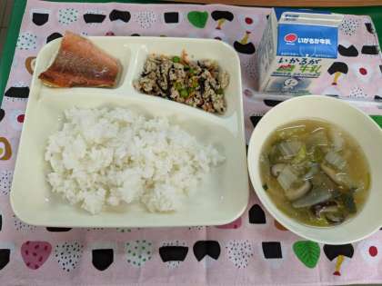 2月16日(火)のこんだては「あかうおのレモンじょうゆかけ、うすくず汁、高野どうふのいり煮、ごはん、牛乳」です。