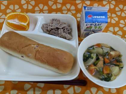 2月17日(水)のこんだては「豚肉のオイスターソース焼き、あつあげとだいこんの中華煮、デコポン、おさつパン、牛乳」です。