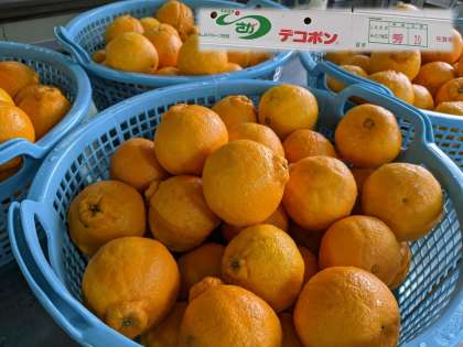 デコポンは「清見」と「ポンカン」をかけ合わせてできた「不知火(しらぬい)」という柑橘です。デコポンという名前は、てっぺんが出っぱった特徴的な形からつけられた名前で、糖度13度以上などの基準が決められている登録商標になっています。