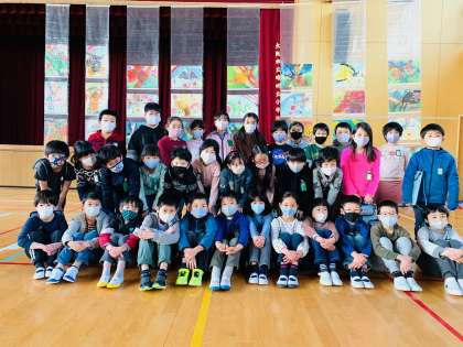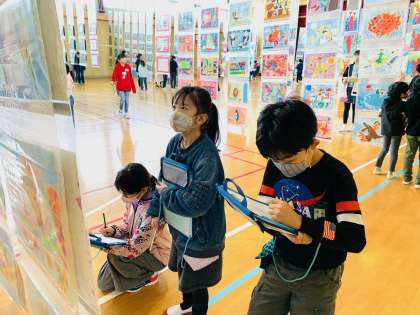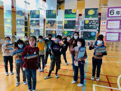 子ども達は、講堂にかざられた自分の作品を見つけて喜んでいました。