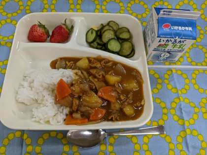 2月19日(金)のこんだては「ポークカレーライス、きゅうりとコーンのサラダ、いちご、牛乳」です。