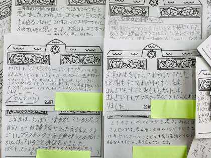 3年生が朝会でプラスチックごみ問題の発表をしたことに対して、4年生が感想のメッセージを書いてくれました。