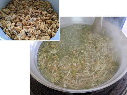 なにわうどんは大阪が発祥といわれる「きつねうどん」をイメージしたこんだてです。こんぶとけずりぶしでだしをとり、三角に切って甘辛く炊いたうすあげを入れています。小袋のとろろこんぶがつくので、自分でのせて食べます。