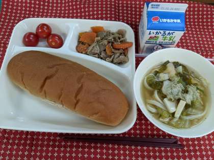 2月22日(月)のこんだては「豚肉とごぼうの煮もの、なにわうどん、プチトマト、黒糖パン、牛乳」です。