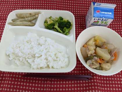2月24日(水)のこんだては「きびなごてんぷら、一口がんもとじゃがいもの煮もの、ブロッコリーのごまあえ、ごはん、牛乳」です。