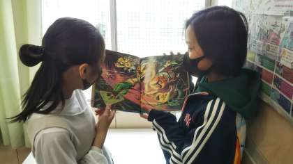 2月最後の登校日。あいにくの雨ですが、5年生の子供たちは、それぞれに工夫して安全に楽しく過ごしています。