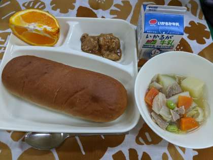 3月2日(火)のこんだては「鶏肉のみそバターソース、スープ煮、デコポン、黒糖パン、牛乳」です。