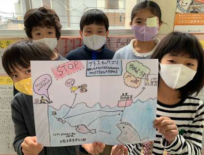 子ども達は、プラスチックごみを減らすために呼びかけるポスターを自主的に作成しています。