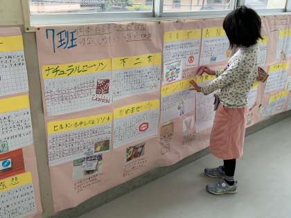 1月に廊下に掲示した調べ学習の新聞も、画鋲が取れていないか、紙がはがれてきていないか確認し、自分たちできれいに直しています。