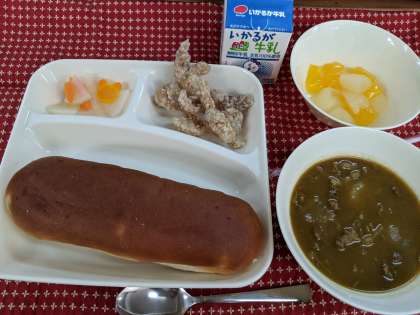 3月4日(木)は卒業祝いこんだてです。「フライドチキン、近江牛のカレーシチュー、おいわいピクルス、フルーツゼリー、おさつパン、牛乳」です。