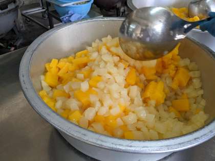フルーツゼリーは、缶詰の梨と、みかんゼリーを合わせたデザートです。