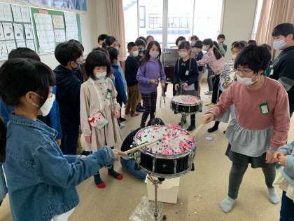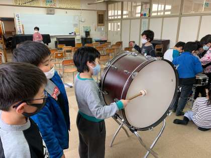 叩いた大太鼓を手で触ってみたり、小太鼓を叩いて紙が跳ねるのを見たり、ピアノの蓋を開けて弦のふるえを確認したり…。