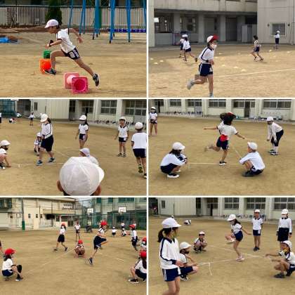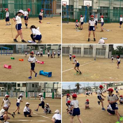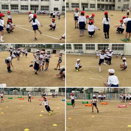 今週の体育では、なわとび・ゴムとび遊びなどをしました。ゴムとび遊びでは、高さを調節したり、とび方を工夫したりする様子が見られます。今週も笑顔いっぱい楽しんで体を動かしました。