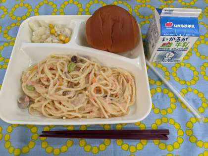 3月11日(木)のこんだては「さけのクリームスパゲッティ、カリフラワーとコーンのサラダ、黒糖パン、牛乳」です。