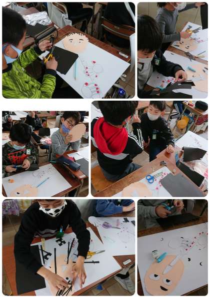 3年1組は紙版画に取り組んでいました。リコーダーを吹く自分を作っていました。