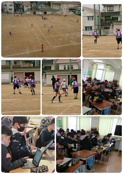 4年1組は、体育でフラッグフットボールをしていました。作戦を立ててチームで対戦していました。