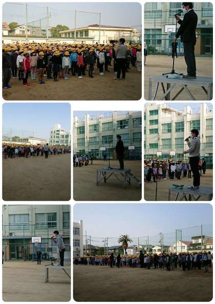 緊急事態宣言が解除され、天気も良かったので、久しぶりに運動場に全員が集まっての朝会になりました。
