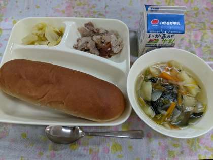 3月18日(木)のこんだては「豚肉のガーリック焼き、スープ、サワーソテー、黒糖パン、牛乳」です。