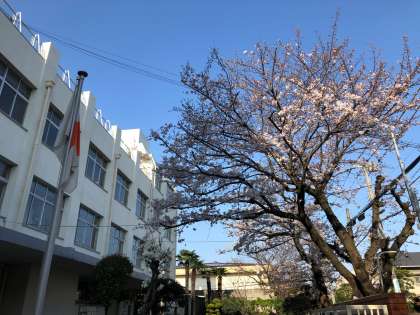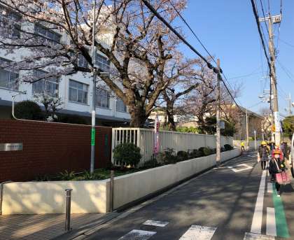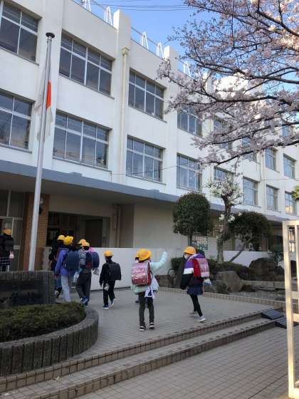 美しい桜の下を、子どもたちは元気よく登校しています。