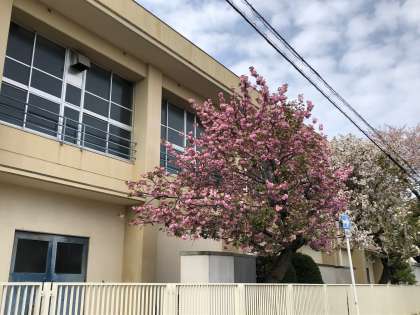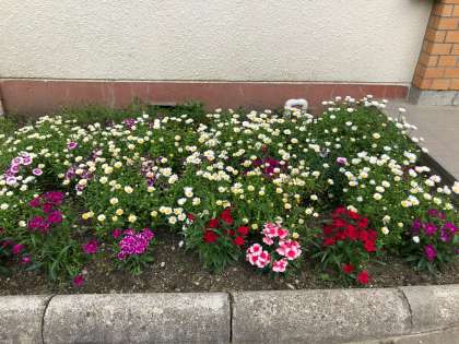 正門の桜は、ピンク色から緑色になってしまいましたが、講堂横の八重桜は満開、花壇の花やプランターも美しい花を咲かせています。