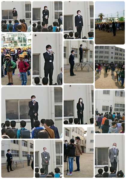 「今日から令和3年度が始まります。みなさんは修了式に校長先生がお話したことを覚えていますか。三つのCのお話です。チェンジ・チャンス・チャレンジ、今こそその時です。新学期が始まって、担任の先生が変わります。友達も、クラスも変わります。自分を変えるチャンスです。そして、新しいことにチャレンジすることができます。今年度一年間、みんなで頑張っていきましょう。