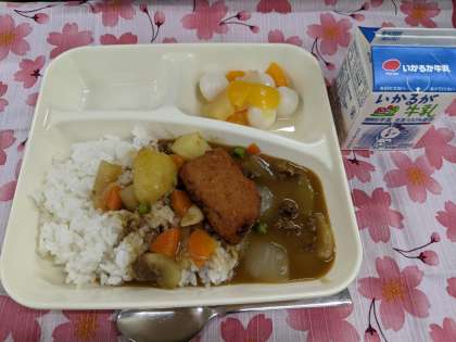 4月12日(月)の献立は「カツカレーライス、フルーツ白玉、牛乳」入学祝い献立です。