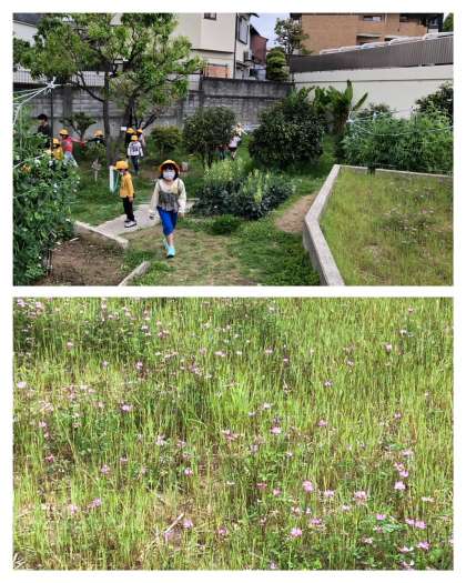 子どもたちは、大喜びで草花や昆虫の観察をしています。5年生が田植えをする田んぼには、れんげが咲いています。