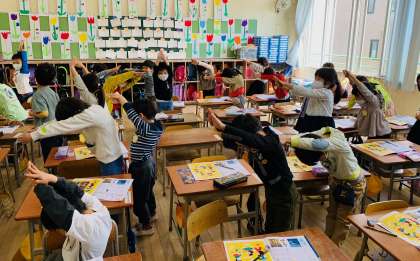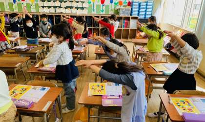 写真は「く」を一生懸命に表現する子ども達の様子です。