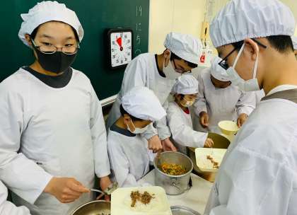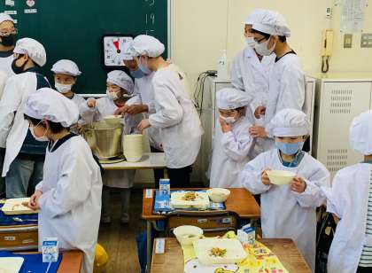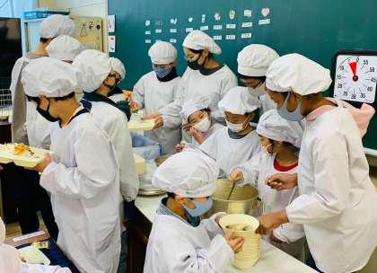 6年生の優しいアドバイスをうけて、1年生も自信を持って給食当番の仕事にチャレンジすることができました。