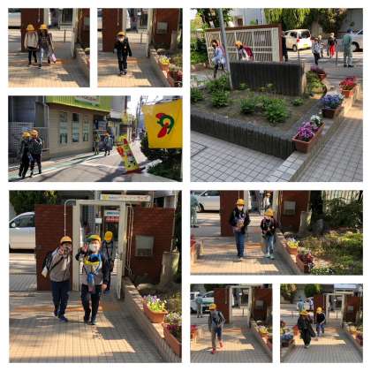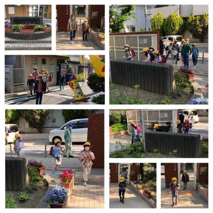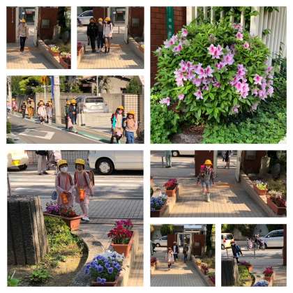子どもたちは、正門のつつじやプランターの花が満開の中を、元気に登校しています。