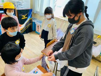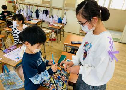 図書委員会の6年生が、1年生の図書バックに図書カードを結びつけてくれました。
