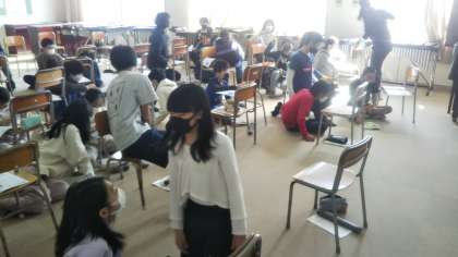 2組は音楽です。「明日という大空」の曲調をつかんで、音楽ワークに書き込んでいます。