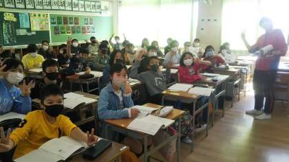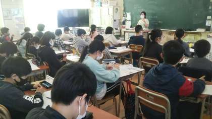 1組は国語です。谷川俊太郎さんの詩を通して「生きるとはどういうことか」考えています。