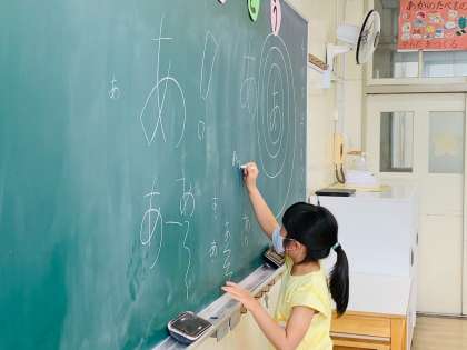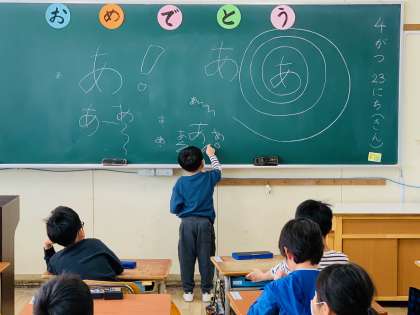 大きな「あ」や、ぐにゃぐにゃの「あ」、小さなうすい「あ」、子ども達が黒板に書いた思い思いの「あ」を、みんなで声を出して読みます。