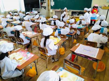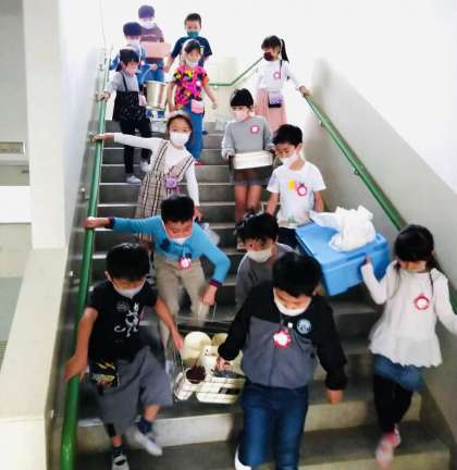調理員さん達のご厚意で、1年生は少し早めに給食を用意していただいています。