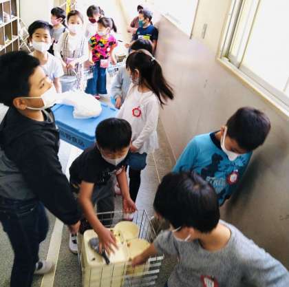 今週から、1年生の子ども達で給食の運搬や配膳を行っています。