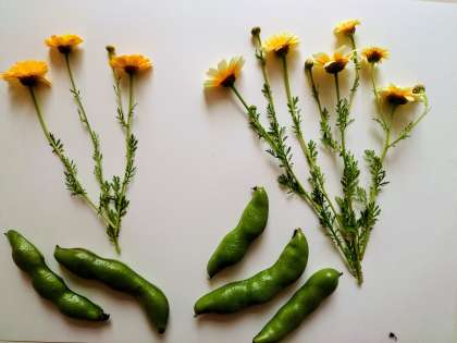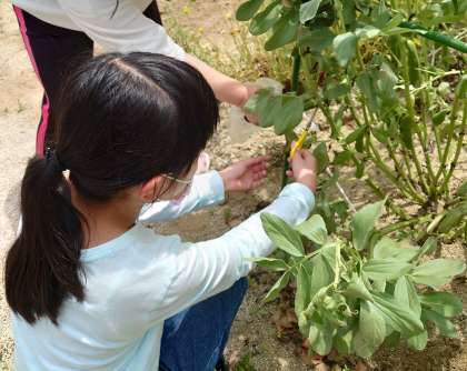 キクナの花やソラマメの鞘、豆や葉の色や形をじっくり観察して描いたり、さやの中に豆がいくつ入っているか予想したり、どのさやが一番大きいか調べたり・・・