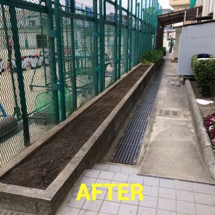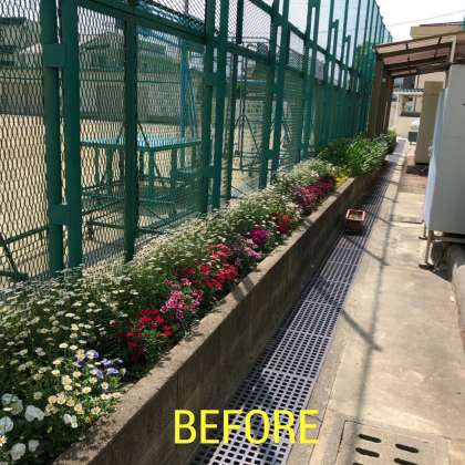 地域の種花事業でいただいた花の苗(クリサンセマム、パンジー、ナデシコ)が見事に成長し、美しい花壇になりました。もう少しこのまま楽しみたいところですが、理科の授業で「へちま」を栽培するため、整地しました。