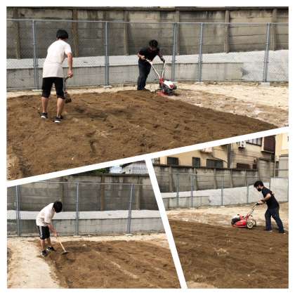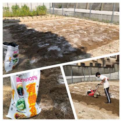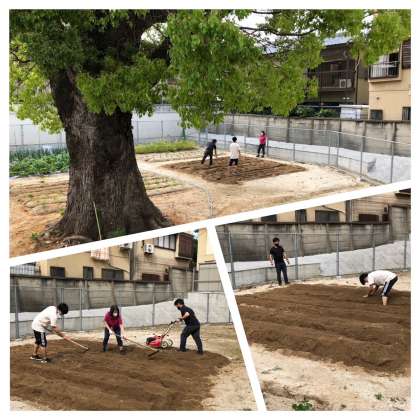 来週、さつまいもの植え付けをするために、2年生の先生方が放課後、畑づくりをしています。有機石灰を混ぜ、耕運機で耕します。続いて畝つくり、1クラス2つの畝で、6畝を作りました。