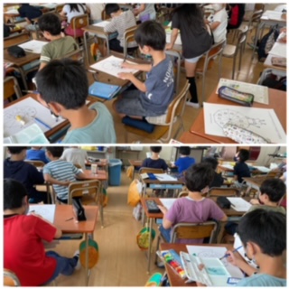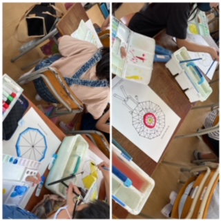 まずは、ペンで傘の柄を描いたあと、絵の具で塗りました。